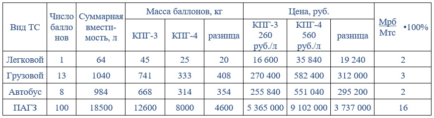 Сравнительный анализ массы и стоимости баллонов разного типа при переводе ТС на метан