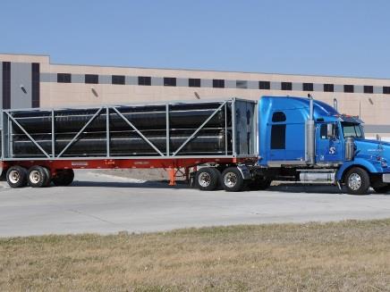 ПАГЗ модульного типа (рис.2) перевозит несколько газобаллонных быстросъемных модулей. Каждый модуль (объем перевозимого газа 560-1000 нм3) снабжен устройством заправки и выдачи газа и поэтому в работе автономен. Перевозку модулей можно осуществлять любым транспортом, оборудованном для перевозки опасных грузов, а также тягачами оснащенными крано-манипуляторными установками. При отсутствии на ПАГЗ крано-манипуляторной установки загрузка и разгрузка модулей может быть осуществлена любым автомобильным краном или кантователем.