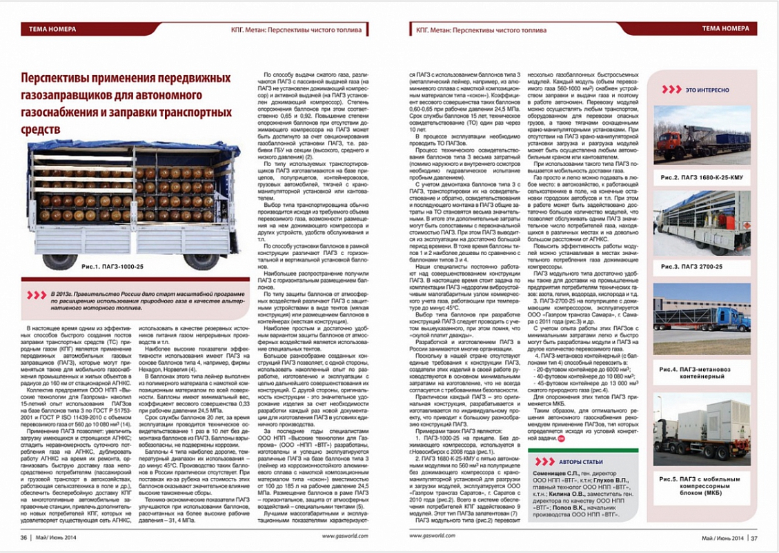 За последние годы специалистами ООО НПП «Высокие технологии для Газпрома» (ООО «НПП «ВТГ») разработаны, изготовлены и успешно эксплуатируются различные ПАГЗ на базе баллонов типа 3 (лейнер из коррозионностойкого алюминиевого сплава с намоткой композиционным материалом типа «кокон») вместимостью от 100 до 185 л на рабочее давление 24,5 МПа. Размещение баллонов в раме ПАГЗ – горизонтальное, защита от атмосферных воздействий – специальными тентами (5).