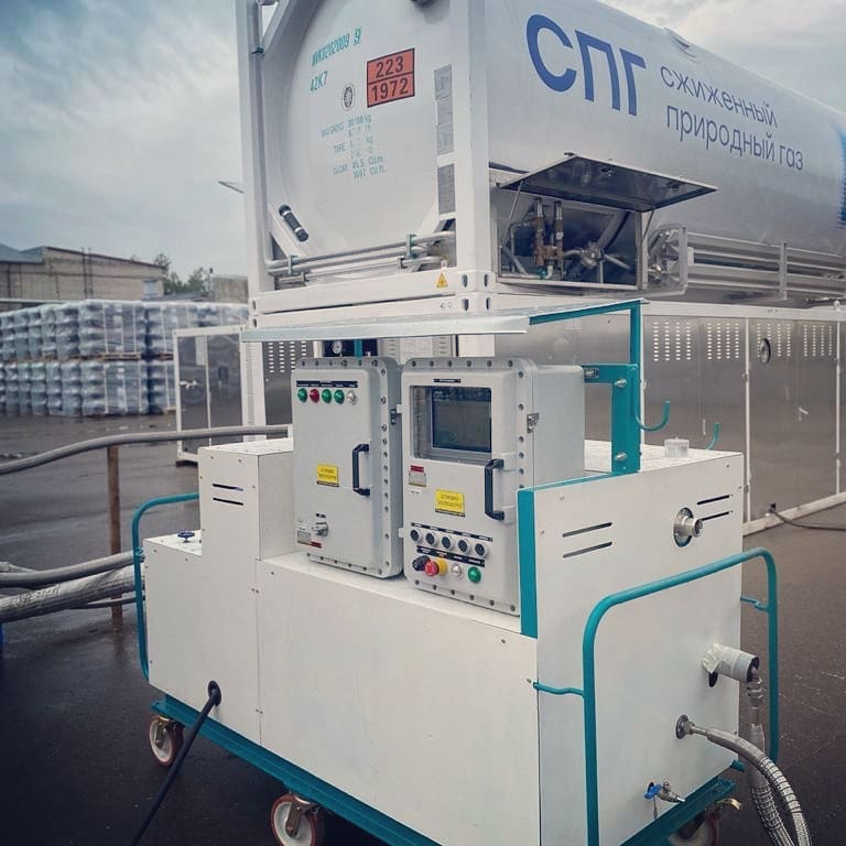 Криогенный насосный модуль выполнен в виде компактного блок-бокса предназначенного для перевозки автомобилем сервисной бригады, обеспечения заправки газомоторных ТС и учета заправляемого газа во время проведения техобслуживания основного газозаправочного оборудования, а также заправки газомоторной техники на конвейерах автопроизводителей.